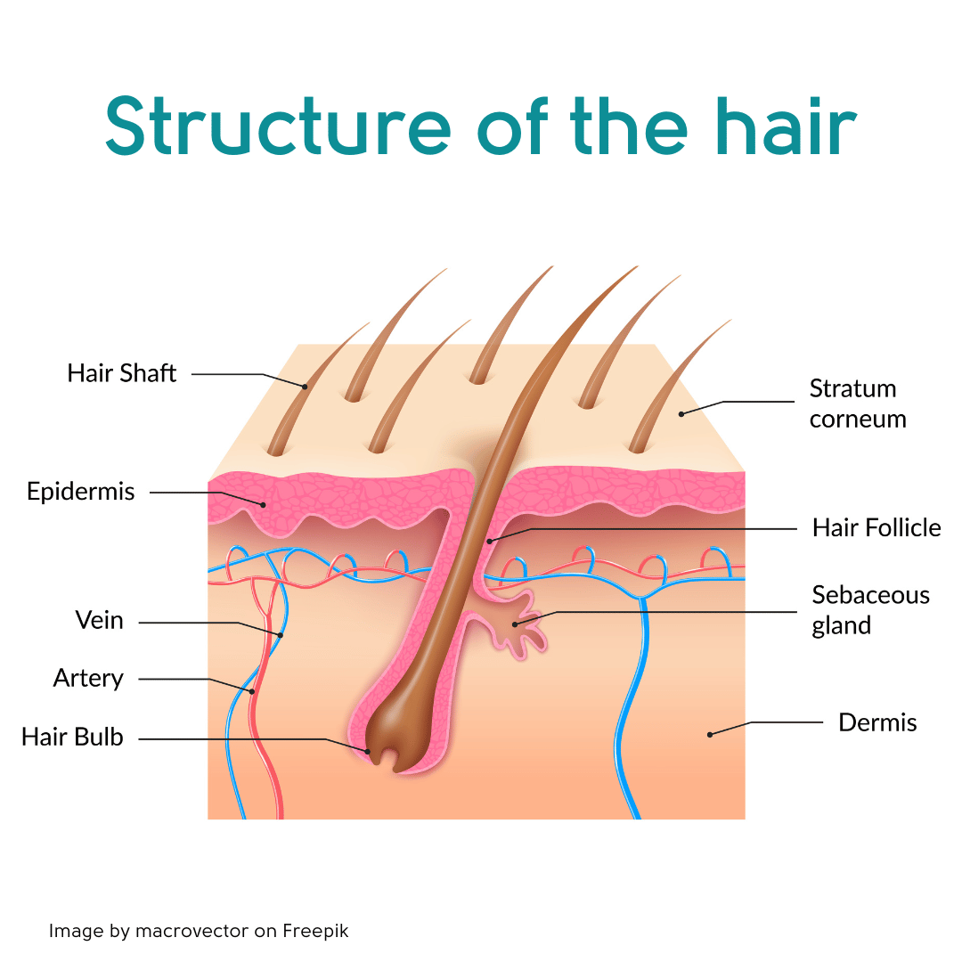 When oestrogen depletes, as it does during the menopause, the testosterone in the hair follicle becomes more prevalent. This then means that if the genetic predisposition to the hair loss condition androgenic alopecia (also known as female pattern hair loss) is present, it can then be triggered. A follicle is a tube-like structure that sits in the dermal part of the skin which houses the hair – see the illustration below showing the structure of the hair: