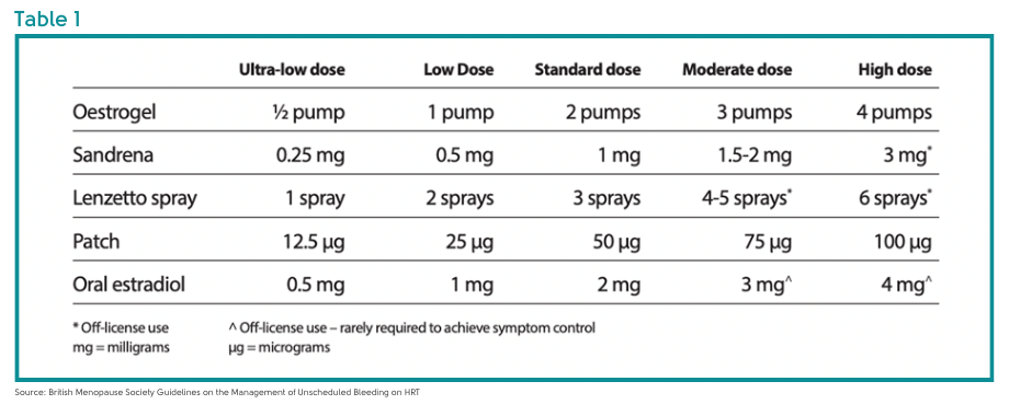 Table 1 shows how the doses of oestrogen are described as ultra-low, low, standard, moderate and high dose: