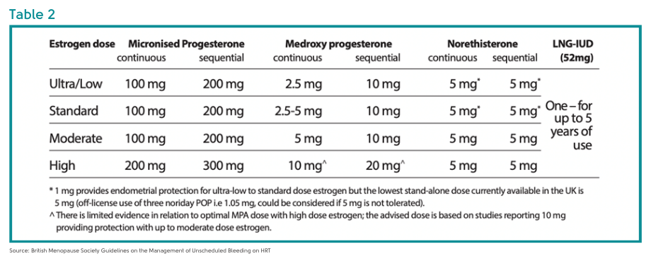 The next two tables are taken from the British Menopause Society Guidelines on the Management of Unscheduled Bleeding on HRT.