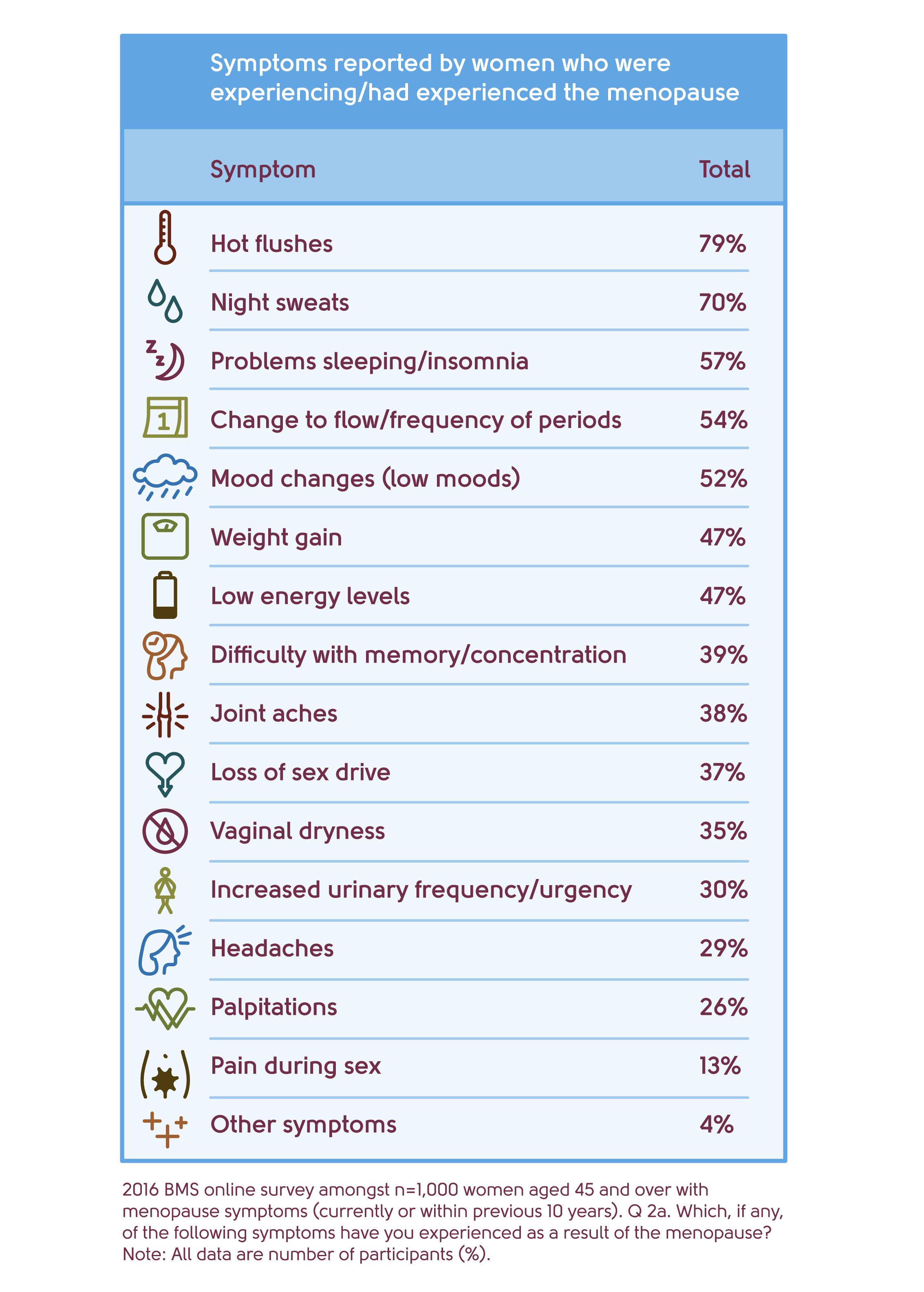The reported incidence of the symptoms of the menopause can vary depending on the source used, and more data exists for some symptoms than for others. That said, we thought it useful to share the following data from an online survey conducted with women aged 45-65 by the British Menopause Society as it gives a good overview of the symptoms that are more/less frequently reported by women. On average, women reported experiencing seven different symptoms.